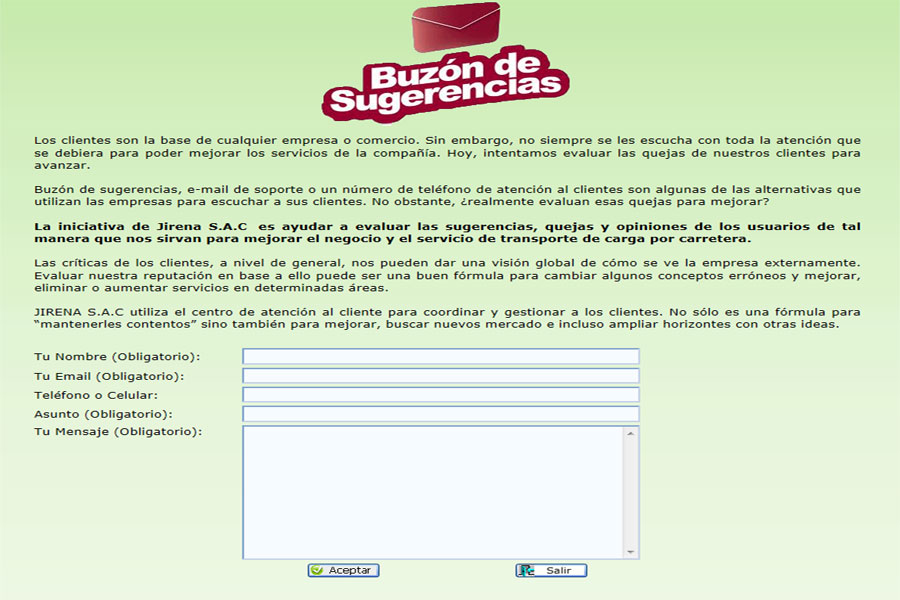 Todos los clientes, proveedores y personal de la empresa, podrán realizar una sugerencia o cotización por el servicio que brinda la empresa. Al realizar el registro del buzón de sugencia, existe una consola de pantalla principal, donde el operador de atención al usuario canaliza y deriva a las áreas administrativas y operativas de la emprea: Administración, personal, Transporte y Contabilidad. Dicha sugerencia para su respectiva evaluación y toda de deciones por parte de la gerencia. |