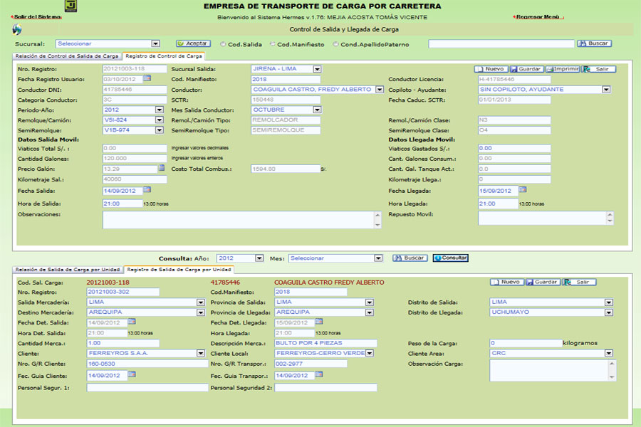 | Historial de Control de Transporte de Carga por Conductor y Movil |