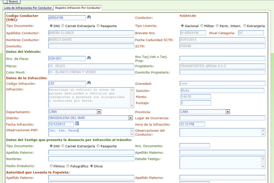 Todas las infracciones ocurridas por el conductor, serán registras en dicho sistema, esto por permitirá tener un historial de conducta del chofer o transportista, estableciendo el nivel de infracciones y registro de la movilidad. |