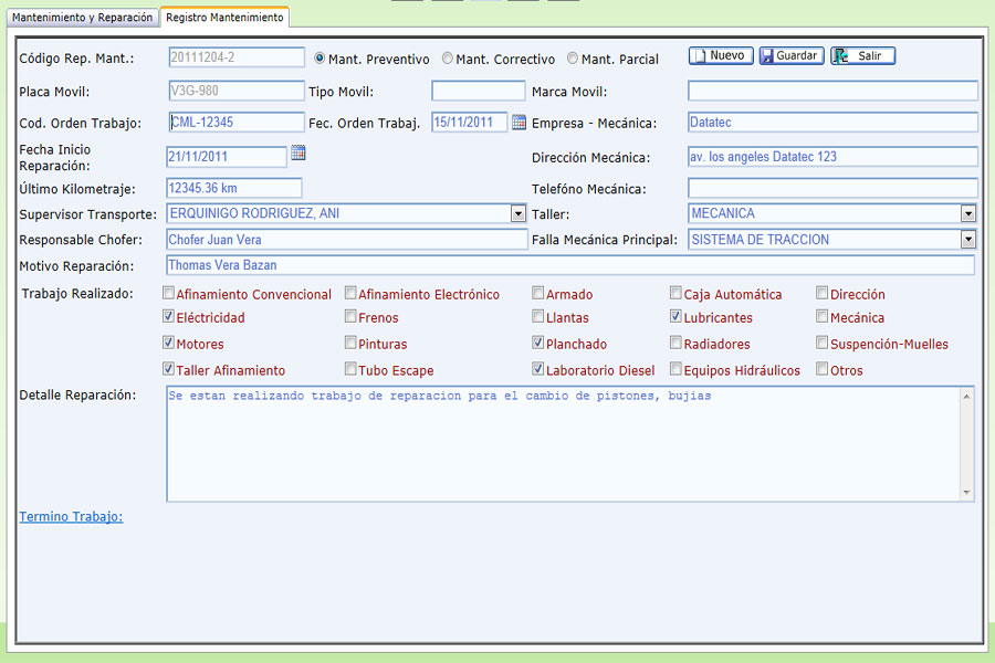 Permite, registrar todos los mantenientos preventivos, correctivas y parcial que se realizan a cada movilidad, establecido el registro en el sistema los trabajos por talleres, cambios de repuestos, accesorios y materiales. |