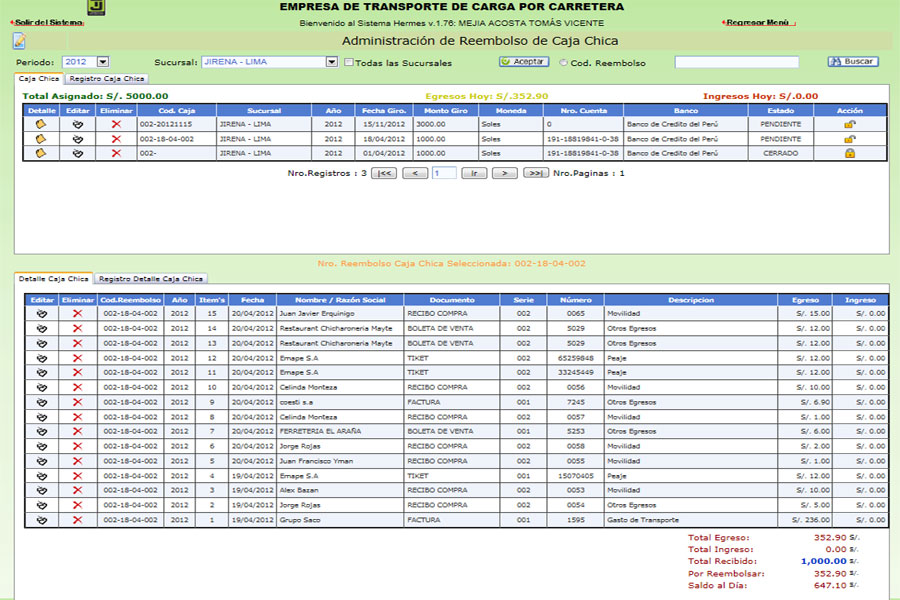 Permite, registrar todos las comisiones que realiza el conductor con la movilidad, estableciendo registro de copiloto, lugar de partidad, lugar de llegada, fecha, hora, cantidad de combustible, odometro, identificación del cliente, nro. de Guia del transportista y del Cliente. Todo esta información está registrado en una pantalla donde al realizar un click por conductor se filtrar dicha información... |