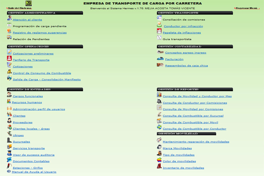 En el menu principal del sistema de control de transporte de carga, permite dar las opciones del acceso a los modulos o pantallas del sistema denpendiendo del tipo de nivel de usuario, para el acceso al sistema, es decir el usuario que tiene acceso a la gestión administrativa, no tendrá acceso al modulo de Gestión de Transporte. Todos los accesos están establecido por tipo de perfil de usuario. |